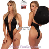 Sexy 1-piece swimsuit with a V Front and a center jewel to keep you covered! The bottom is half coverage. Made in unique fabrics.