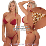 Gorgeous Burgundy Fabric with Gold AB Crystal Jewel back for a unique look. This Glamorous string bikini is perfect for a bikini contest, sexy photo shoots, or a fun weekend! The top is a "rounded" B cup (between B and C cups). The bottom is a nice low cut with a unique mesh jewel on the back (size small).