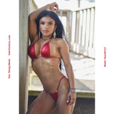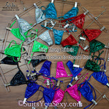 Made in beautiful hologram fabrics! Tiny Thong Bottom with Tiny Bikini Top. Perfect for extreme bikini contests, sexy swimwear photo shoots, or weekend getaways! The Red Shatterglass is great for Valentine's Day; the shiny black version is perfect for Bike Week!