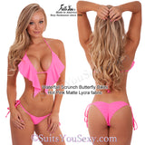 Such a Cute Top! Made in several beautiful solid matte Lycra fabrics. This unique Waterfall style top looks great on any cup size! Unique sexy swimsuit for a day at the beach, pool, or boat! The bottom has a dip at the top of the back to give you a nice "round" look, minimal coverage and has tie-sides for a perfect fit every time. The top is a rounded B cup (in between B cup and C cup).